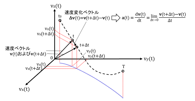 そして、速度と同様に、各時刻の加速度ベクトルをa(t)と表すと加速度ベクトルは速度変化ベクトルまたは速度ベクトルを用いて