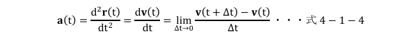また、加速度も速度ベクトルの差をスカラー量であるΔtで割って、限りなく0に近づけているのでベクトルとなります(図4-1-8)。