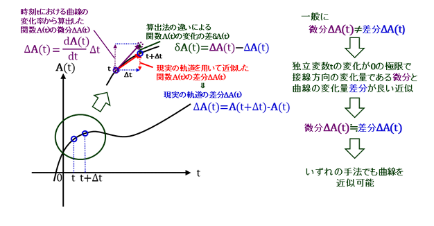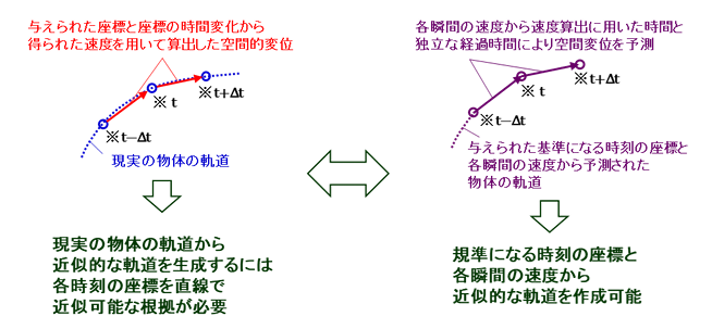 ちなみに、物体の軌道の関数のみから軌道を決定していく手法と加速度の関数から物体の軌道を決定する手法は一般に異なる結果が得られます。 しかし、離散的な関数から移動量を算出する方法と連続関数から移動量を予測する方法、双方において各区画で速度が一定とみなせる程度に時間間隔を十分短くすると、既知の離散的な軌道を非常に短い直線で近似したものを接続することと、軌道を予測する方法において加速度は速度の時間変化率であるという定義から連続な関数である加速度を用いて極めて連続的な離散的関数である速度を算出した後、同様に極めて連続的な離散的関数である速度から同様の性質を有する物体の座標を予測することは、どちらも極めて良い近似になると考えられるためにほぼ一致すると考えることができます(図4-1-3)。