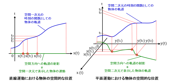 以上を念頭に、時空内における物体の軌道に準じた見方で時刻の関数で表された物体の軌道を空間内における物体の座標値の組で表示する方法を提示すれば、1次元の運動の例では、図4-1-4左図に示すように、各時刻における物体の位置を記録していって、基準になる時刻(通常時刻0における直線)の空間成分上に時空内の曲線から空間座標を射影して各点を通過した時刻を表示した図が、2次元の運動の例では、図4-1-4右図に示すように、時刻と直交する各時刻の平面上を通過する物体の位置を記録していって、基準になる時刻(通常時刻0における平面)の空間成分上に時空内の曲線から空間座標を射影して各点を通過した時刻を表示した図が空間内における物体の軌道を表示した図4-1-1、図4-1-2に対応します。また、図4-1-3の形式で時刻を独立変数として見たい場合は図4-1-4の形式の座標系を回転して横軸を時間軸にすれば必要な図が得られます。