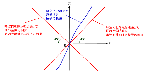 特殊相対性理論における時空図は図4-1-5のように縦軸に時間軸、時間軸と直交するように空間軸を配して表示され、最も一般的な時空の変換では時間と空間が混在する変換になることが要請されるため、これらの単位を揃える必要性と人間活動を基準にした空間的間隔を[m]、時間的間隔を[s]とする単位系での時空の間隔の表示では相対論的効果の表れる光速の10%程度からの速度帯を扱うことが困難になる問題から(通常の単位で速度1000m/sと10000m/sの粒子の軌道を描図するだけで区別が困難)、時間は各時刻に光速c=3.0×108m/sを乗じて時間軸を引き伸ばして時刻を距離の単位[m]で表示することで、高速度域に特化した光速度を無次元の1とする単位系を用いて表現されます。