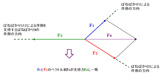 実際、ばねばかりを用いた図4-1-9に示す静的な実験では、力F1と力F2のベクトル和F4が力F3と釣り合うという結果が得られることから、私たちが力と呼んでいる作用はベクトル的な合成が可能であるため、力はベクトル量であると結論しています。
